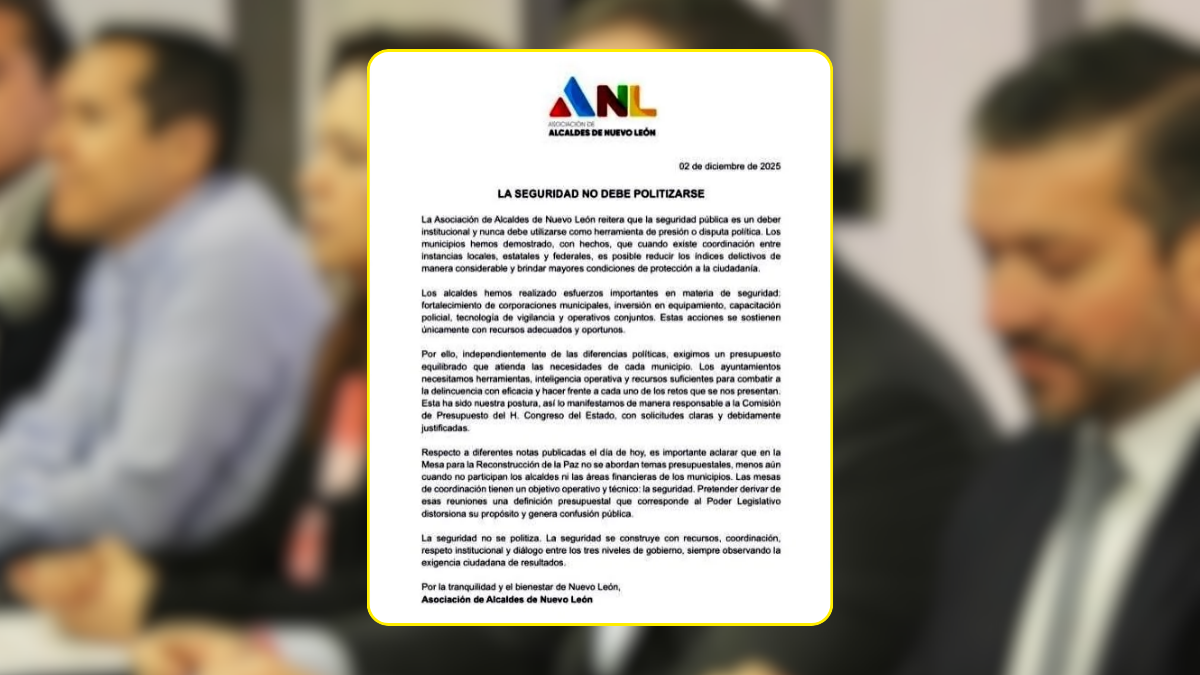 En medio de la creciente controversia, la Asociación de Alcaldes emitió un comunicado. En él, aclaró que la mesa de seguridad en Nuevo León atiende únicamente temas relacionados con operativos, coordinación entre corporaciones y análisis delictivo. Subrayó que nunca se han discutido cifras, incrementos o decisiones relacionadas con el Presupuesto 2026 en ese espacio.